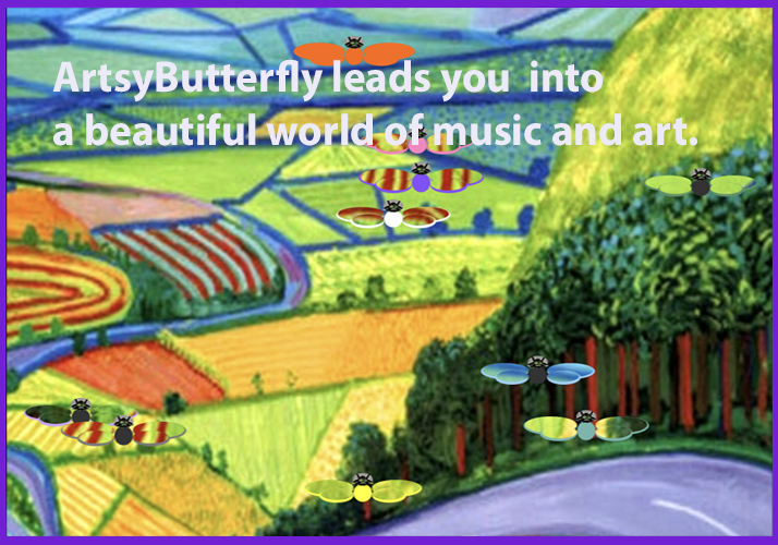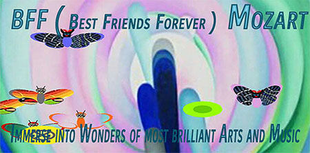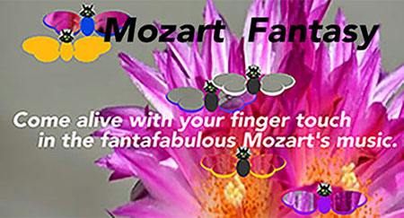 of back-ground photos. Flying butterflies are spirits of the musical geniuses like Mozart, Beethoven and